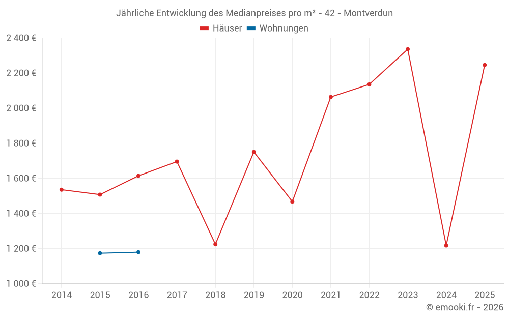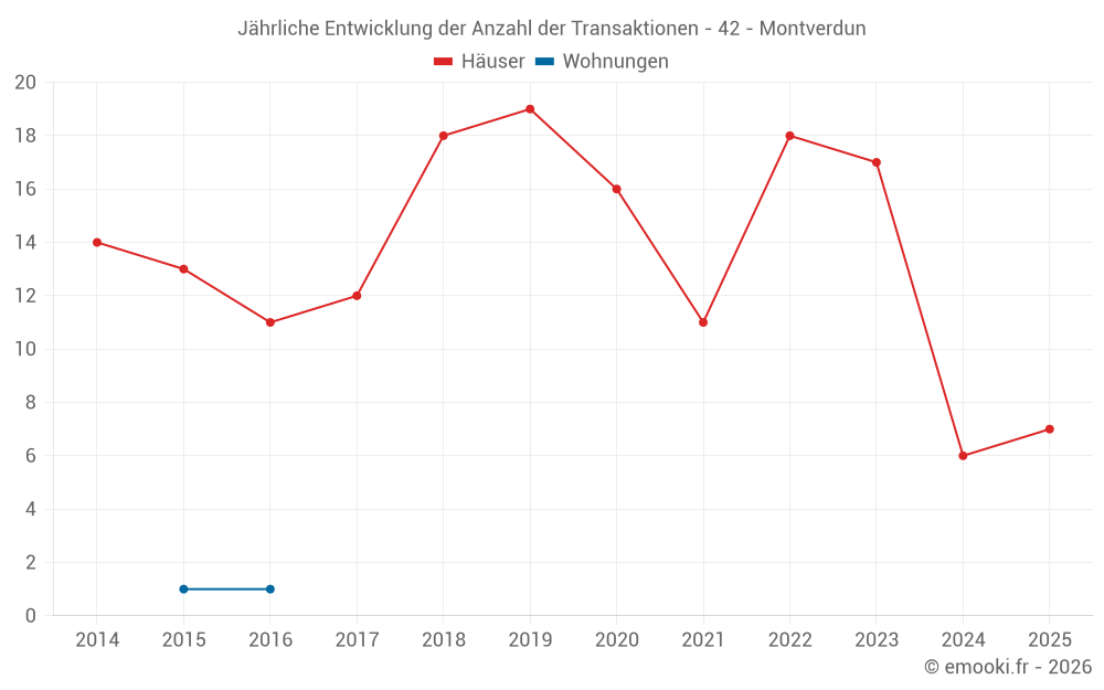 Der Durchschnittspreis auf den 18 Hausgeschäften der letzten 24 Monate in der Gemeinde Montverdun betrug 1 808 € pro Quadratmeter für einen mittleren Immobilienwert von 185 000 €. Über diesen Zeitraum hinweg lagen 60% der Transaktionen zwischen 1 207 und 2 682 € pro Quadratmeter (vom 2. bis zum 8. Dezil).