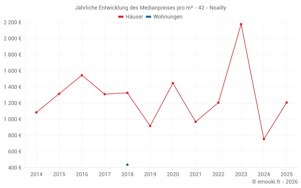 Der Durchschnittspreis auf den 16 Hausgeschäften der letzten 24 Monate in der Gemeinde Noailly betrug 1 627 € pro Quadratmeter für einen mittleren Immobilienwert von 148 775 €. Über diesen Zeitraum hinweg lagen 60% der Transaktionen zwischen 687 und 2 375 € pro Quadratmeter (vom 2. bis zum 8. Dezil).