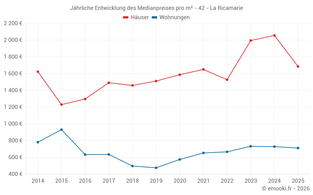 Der Durchschnittspreis auf den 20 Hausgeschäften der letzten 12 Monate in der Gemeinde La Ricamarie betrug 2 040 € pro Quadratmeter für einen mittleren Immobilienwert von 189 000 €. Über diesen Zeitraum hinweg lagen 60% der Transaktionen zwischen 1 359 und 2 455 € pro Quadratmeter (vom 2. bis zum 8. Dezil).