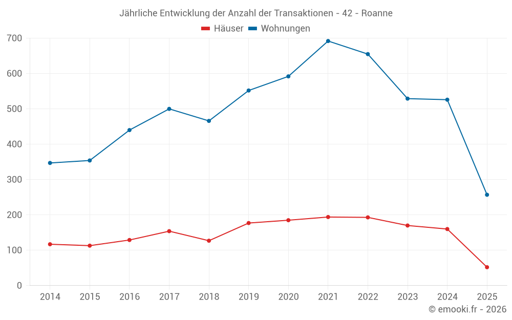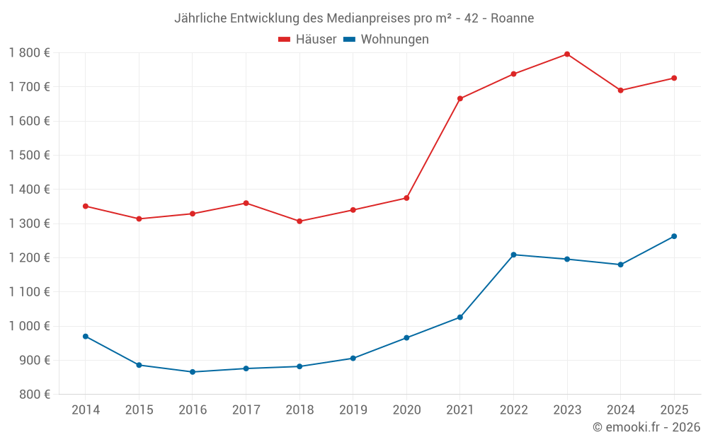 Der Durchschnittspreis auf den 23 Hausgeschäften der letzten 3 Monate in der Gemeinde Roanne betrug 1 741 € pro Quadratmeter für einen mittleren Immobilienwert von 118 000 €. Über diesen Zeitraum hinweg lagen 60% der Transaktionen zwischen 1 252 und 2 119 € pro Quadratmeter (vom 2. bis zum 8. Dezil).