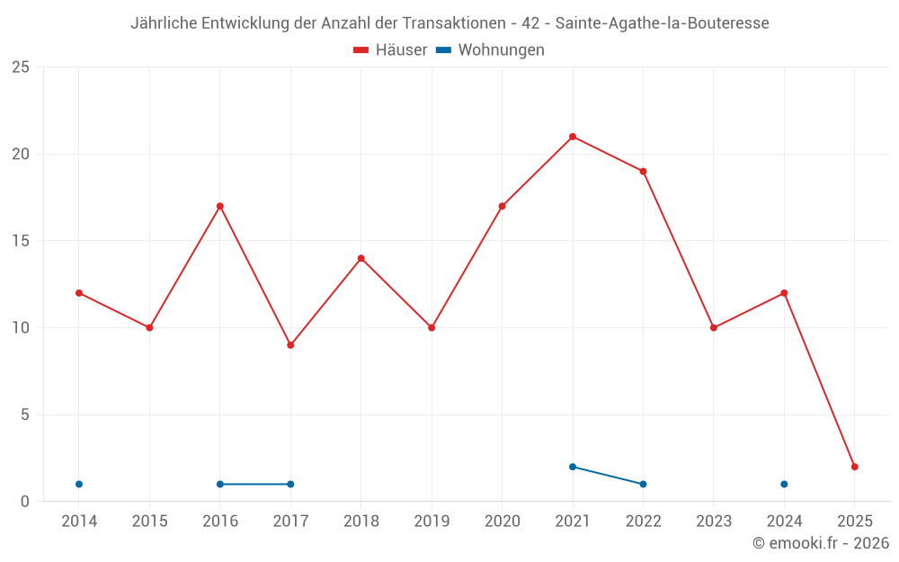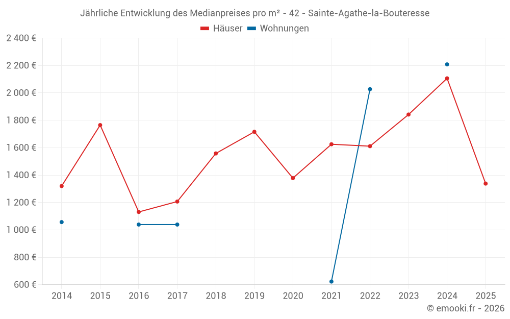 Der Durchschnittspreis auf den 18 Hausgeschäften der letzten 24 Monate in der Gemeinde Sainte-Agathe-la-Bouteresse betrug 2 036 € pro Quadratmeter für einen mittleren Immobilienwert von 201 250 €. Über diesen Zeitraum hinweg lagen 60% der Transaktionen zwischen 1 730 und 2 210 € pro Quadratmeter (vom 2. bis zum 8. Dezil).