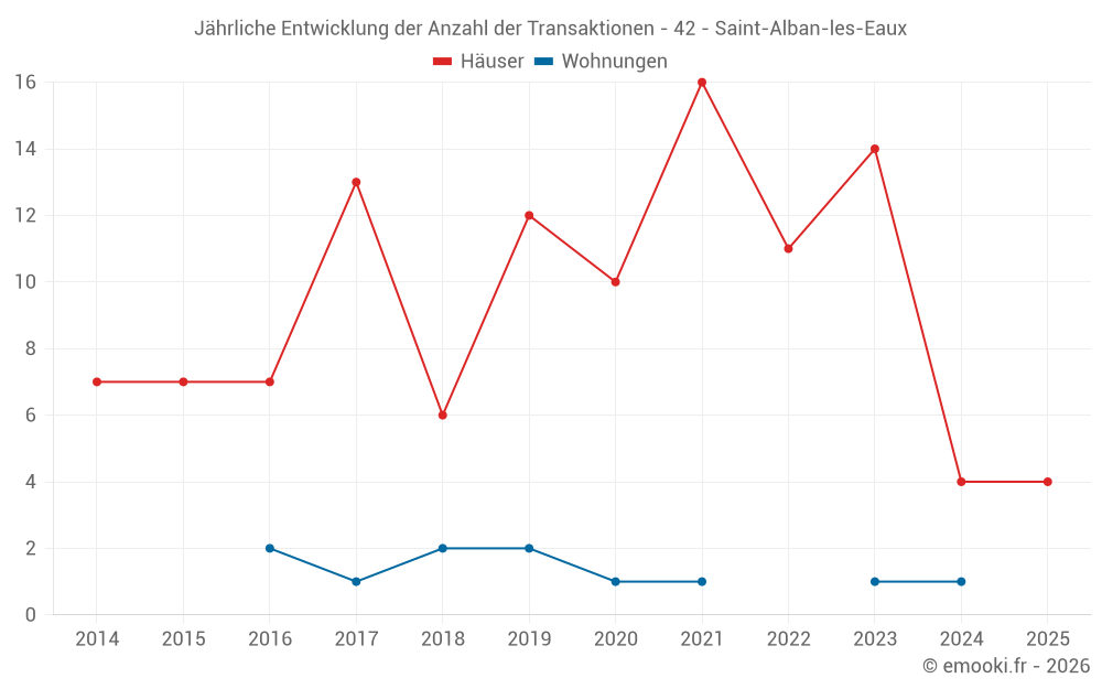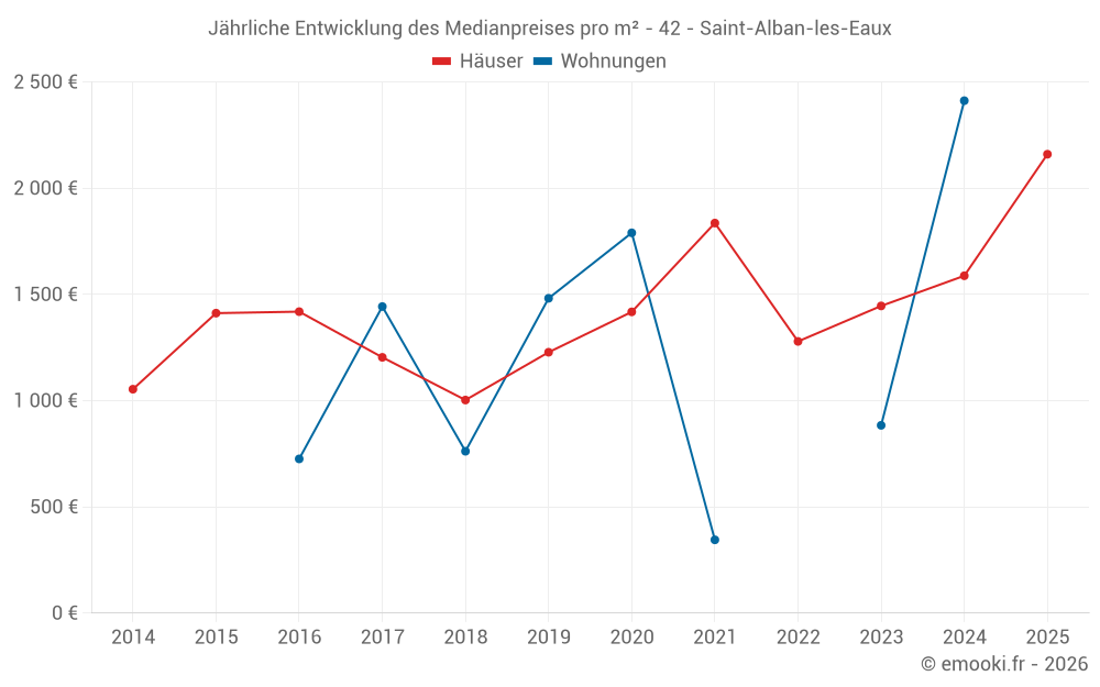 Der Durchschnittspreis auf den 20 Hausgeschäften der letzten 24 Monate in der Gemeinde Saint-Alban-les-Eaux betrug 1 472 € pro Quadratmeter für einen mittleren Immobilienwert von 125 000 €. Über diesen Zeitraum hinweg lagen 60% der Transaktionen zwischen 1 211 und 2 274 € pro Quadratmeter (vom 2. bis zum 8. Dezil).