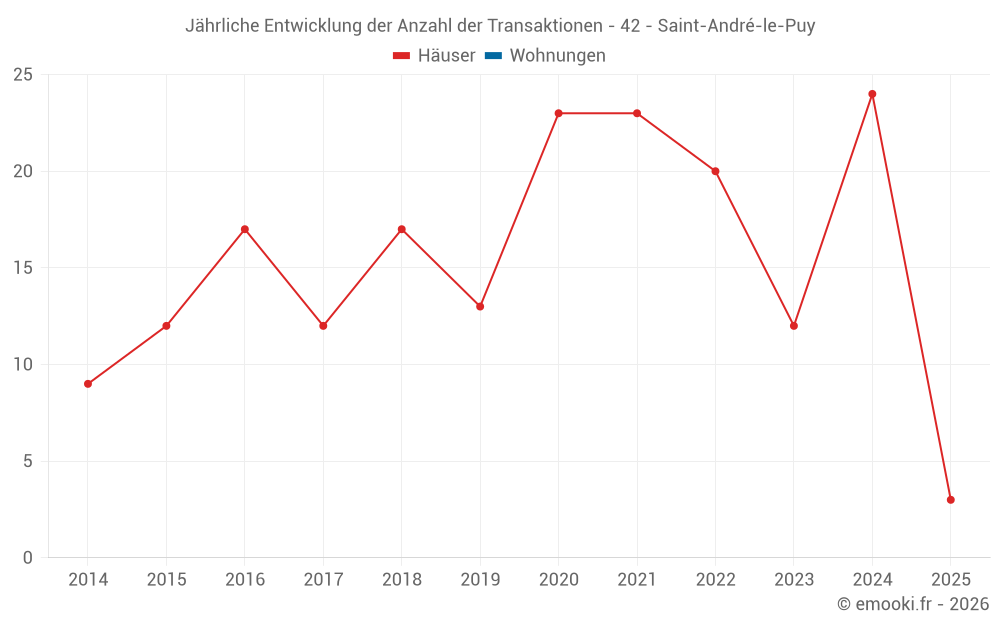 Der Durchschnittspreis auf den 16 Hausgeschäften der letzten 12 Monate in der Gemeinde Saint-André-le-Puy betrug 2 222 € pro Quadratmeter für einen mittleren Immobilienwert von 230 625 €. Über diesen Zeitraum hinweg lagen 60% der Transaktionen zwischen 1 553 und 2 605 € pro Quadratmeter (vom 2. bis zum 8. Dezil).