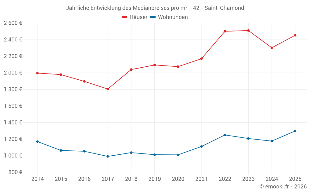 Der Durchschnittspreis auf den 33 Hausgeschäften der letzten 6 Monate in der Gemeinde Saint-Chamond betrug 2 452 € pro Quadratmeter für einen mittleren Immobilienwert von 235 000 €. Über diesen Zeitraum hinweg lagen 60% der Transaktionen zwischen 1 663 und 2 883 € pro Quadratmeter (vom 2. bis zum 8. Dezil).