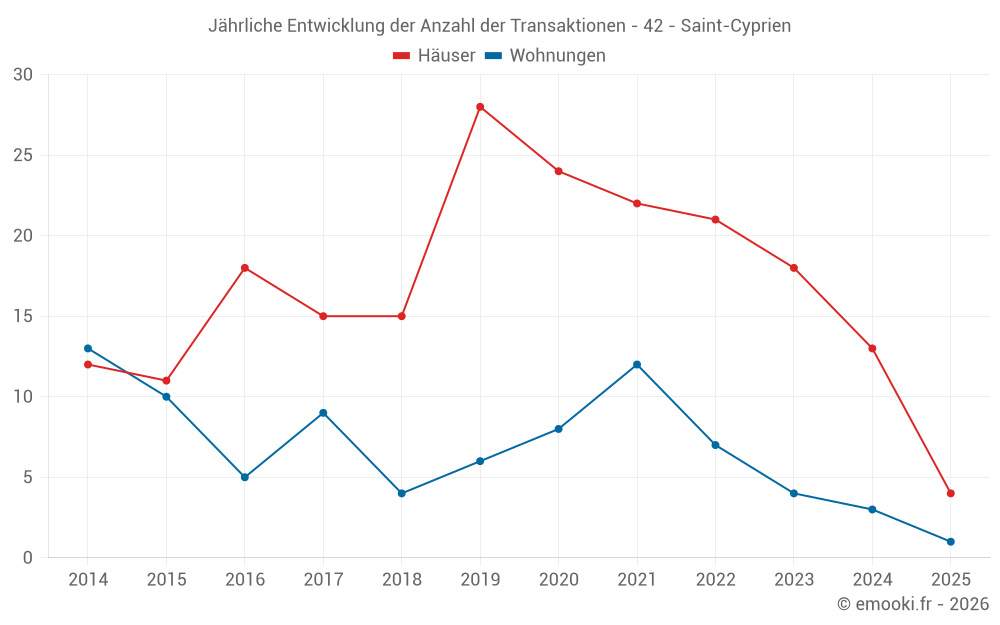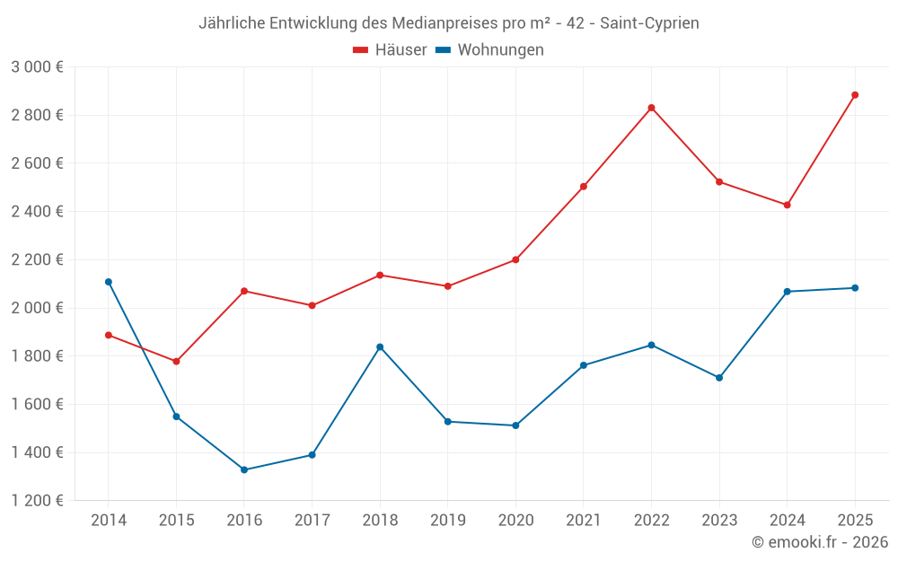 Der Durchschnittspreis auf den 30 Hausgeschäften der letzten 24 Monate in der Gemeinde Saint-Cyprien betrug 2 497 € pro Quadratmeter für einen mittleren Immobilienwert von 244 100 €. Über diesen Zeitraum hinweg lagen 60% der Transaktionen zwischen 2 063 und 2 719 € pro Quadratmeter (vom 2. bis zum 8. Dezil).