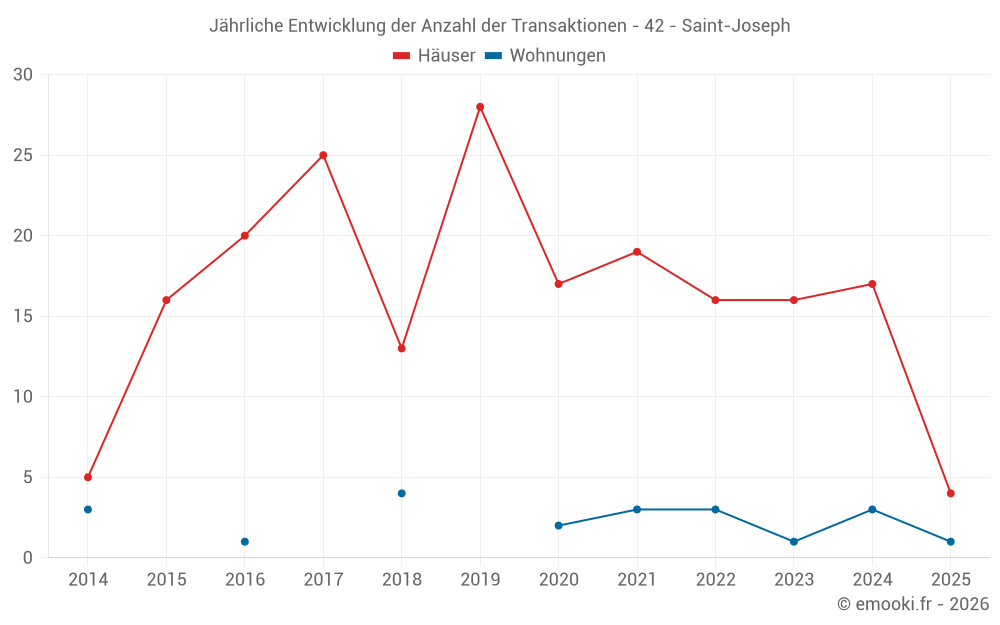 Der Durchschnittspreis auf den 31 Hausgeschäften der letzten 24 Monate in der Gemeinde Saint-Joseph betrug 2 636 € pro Quadratmeter für einen mittleren Immobilienwert von 256 000 €. Über diesen Zeitraum hinweg lagen 60% der Transaktionen zwischen 2 194 und 2 973 € pro Quadratmeter (vom 2. bis zum 8. Dezil).