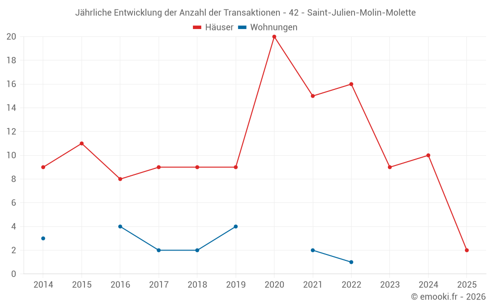 Der Durchschnittspreis auf den 18 Hausgeschäften der letzten 24 Monate in der Gemeinde Saint-Julien-Molin-Molette betrug 792 € pro Quadratmeter für einen mittleren Immobilienwert von 97 450 €. Über diesen Zeitraum hinweg lagen 60% der Transaktionen zwischen 645 und 2 086 € pro Quadratmeter (vom 2. bis zum 8. Dezil).