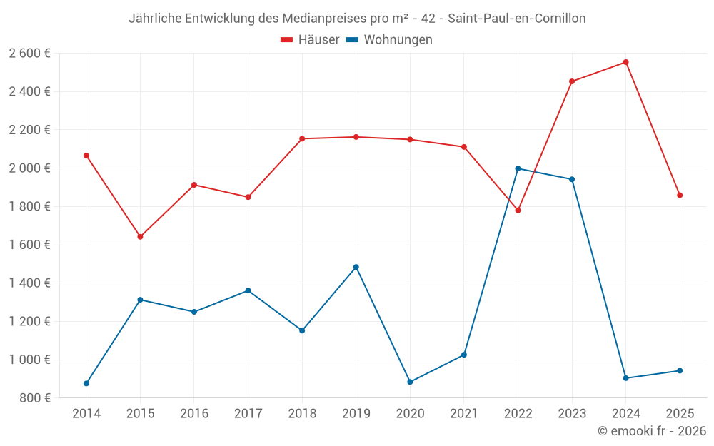 Der Durchschnittspreis auf den 26 Hausgeschäften der letzten 24 Monate in der Gemeinde Saint-Paul-en-Cornillon betrug 2 458 € pro Quadratmeter für einen mittleren Immobilienwert von 249 765 €. Über diesen Zeitraum hinweg lagen 60% der Transaktionen zwischen 1 788 und 2 870 € pro Quadratmeter (vom 2. bis zum 8. Dezil).