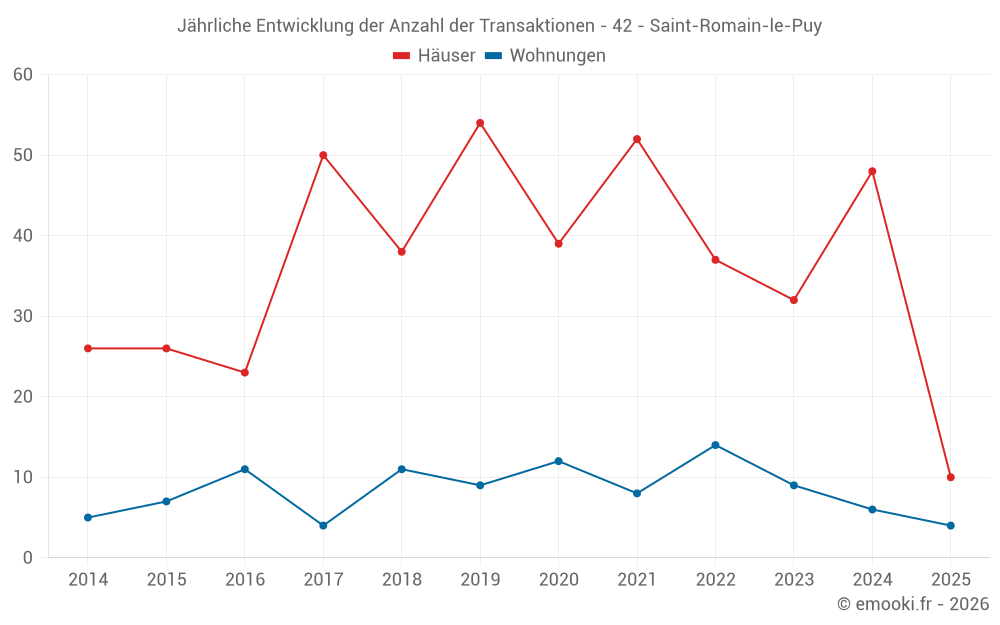 Der Durchschnittspreis auf den 35 Hausgeschäften der letzten 12 Monate in der Gemeinde Saint-Romain-le-Puy betrug 2 267 € pro Quadratmeter für einen mittleren Immobilienwert von 204 900 €. Über diesen Zeitraum hinweg lagen 60% der Transaktionen zwischen 1 575 und 2 620 € pro Quadratmeter (vom 2. bis zum 8. Dezil).
