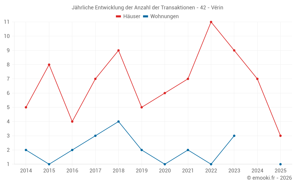 Der Durchschnittspreis auf den 17 Hausgeschäften der letzten 24 Monate in der Gemeinde Vérin betrug 2 576 € pro Quadratmeter für einen mittleren Immobilienwert von 201 580 €. Über diesen Zeitraum hinweg lagen 60% der Transaktionen zwischen 1 135 und 3 956 € pro Quadratmeter (vom 2. bis zum 8. Dezil).