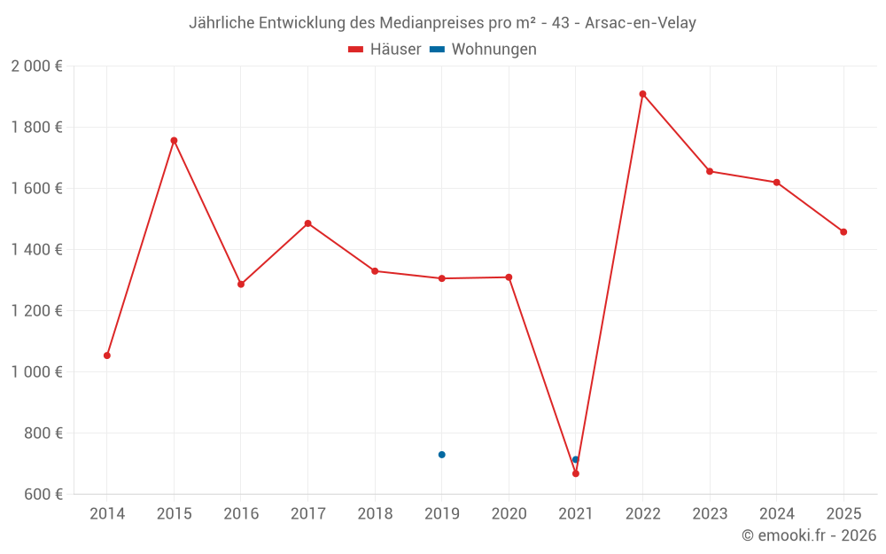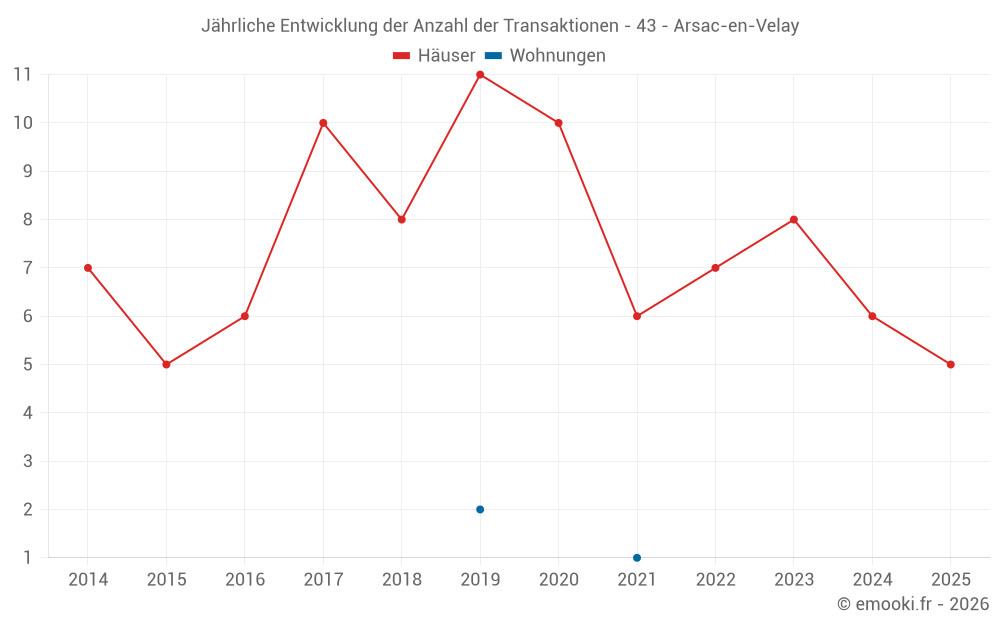 Der Durchschnittspreis auf den 15 Hausgeschäften der letzten 24 Monate in der Gemeinde Arsac-en-Velay betrug 1 493 € pro Quadratmeter für einen mittleren Immobilienwert von 131 500 €. Über diesen Zeitraum hinweg lagen 60% der Transaktionen zwischen 1 084 und 1 660 € pro Quadratmeter (vom 2. bis zum 8. Dezil).