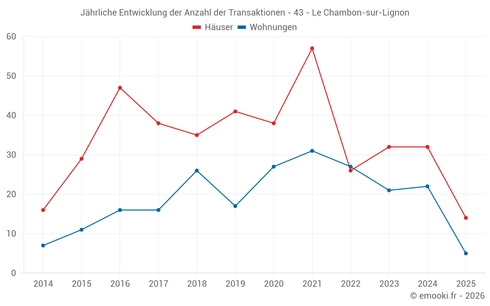 Der Durchschnittspreis auf den 17 Wohnungstransaktionen der letzten 12 Monate in der Gemeinde Le Chambon-sur-Lignon betrug 1 080 € pro Quadratmeter für einen mittleren Immobilienwert von 65 000 €. Über diesen Zeitraum hinweg lagen 60% der Transaktionen zwischen 894 und 1 332 € pro Quadratmeter (vom 2. bis zum 8. Dezil).