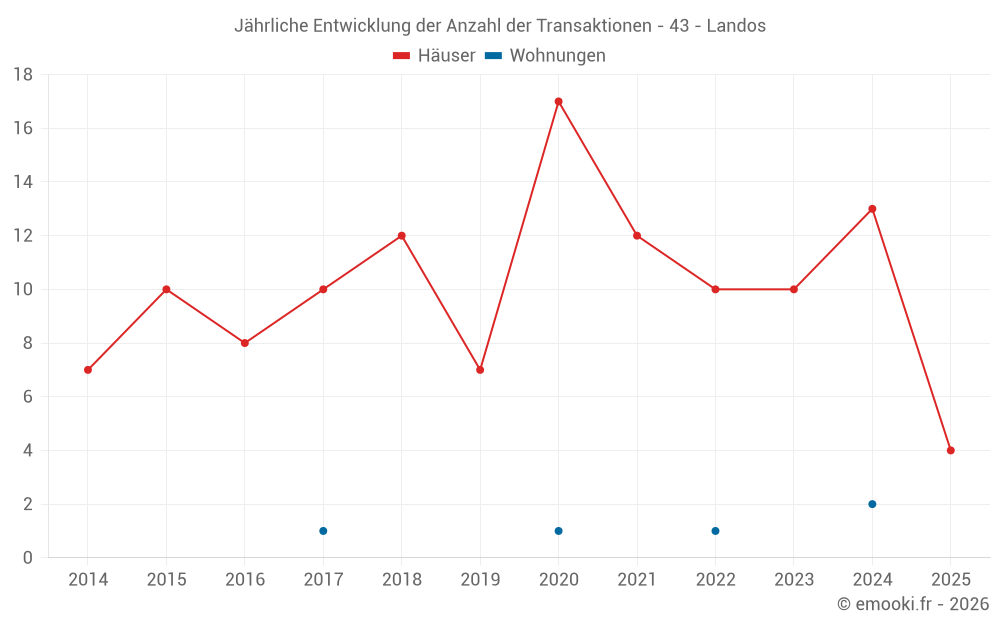Der Durchschnittspreis auf den 23 Hausgeschäften der letzten 24 Monate in der Gemeinde Landos betrug 1 042 € pro Quadratmeter für einen mittleren Immobilienwert von 100 000 €. Über diesen Zeitraum hinweg lagen 60% der Transaktionen zwischen 513 und 1 587 € pro Quadratmeter (vom 2. bis zum 8. Dezil).