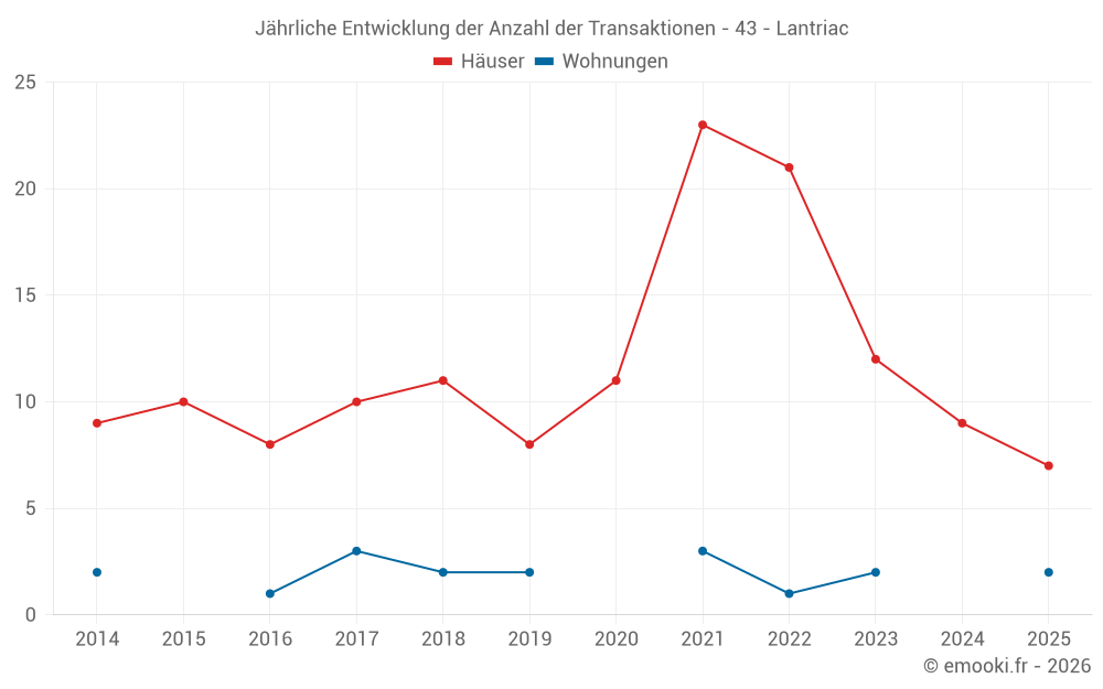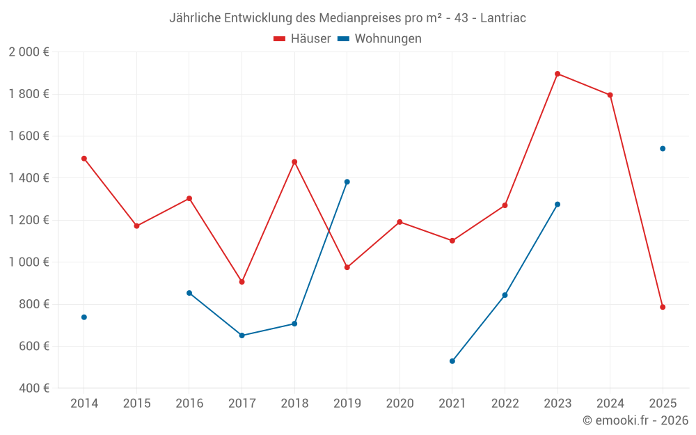 Der Durchschnittspreis auf den 26 Hausgeschäften der letzten 24 Monate in der Gemeinde Lantriac betrug 1 772 € pro Quadratmeter für einen mittleren Immobilienwert von 161 250 €. Über diesen Zeitraum hinweg lagen 60% der Transaktionen zwischen 769 und 2 129 € pro Quadratmeter (vom 2. bis zum 8. Dezil).