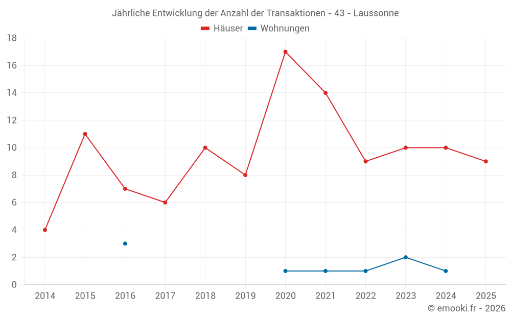 Der Durchschnittspreis auf den 17 Hausgeschäften der letzten 12 Monate in der Gemeinde Laussonne betrug 1 609 € pro Quadratmeter für einen mittleren Immobilienwert von 113 050 €. Über diesen Zeitraum hinweg lagen 60% der Transaktionen zwischen 896 und 2 234 € pro Quadratmeter (vom 2. bis zum 8. Dezil).