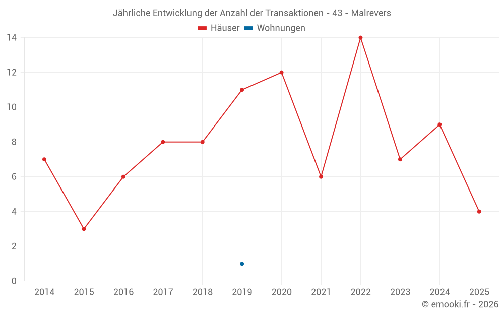 Der Durchschnittspreis auf den 16 Hausgeschäften der letzten 24 Monate in der Gemeinde Malrevers betrug 1 308 € pro Quadratmeter für einen mittleren Immobilienwert von 155 500 €. Über diesen Zeitraum hinweg lagen 60% der Transaktionen zwischen 644 und 1 765 € pro Quadratmeter (vom 2. bis zum 8. Dezil).