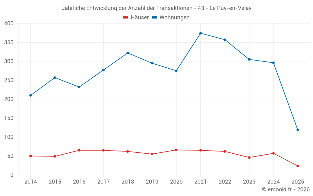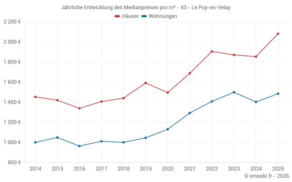 Der Durchschnittspreis auf den 24 Hausgeschäften der letzten 6 Monate in der Gemeinde Le Puy-en-Velay betrug 2 081 € pro Quadratmeter für einen mittleren Immobilienwert von 185 200 €. Über diesen Zeitraum hinweg lagen 60% der Transaktionen zwischen 1 352 und 2 409 € pro Quadratmeter (vom 2. bis zum 8. Dezil).