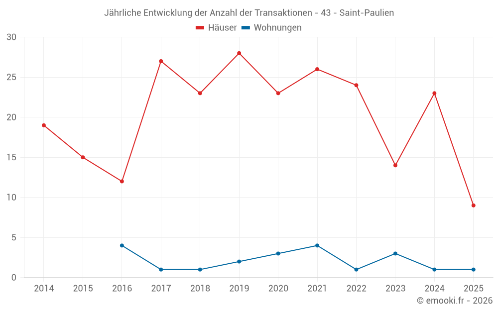 Der Durchschnittspreis auf den 23 Hausgeschäften der letzten 12 Monate in der Gemeinde Saint-Paulien betrug 1 245 € pro Quadratmeter für einen mittleren Immobilienwert von 132 500 €. Über diesen Zeitraum hinweg lagen 60% der Transaktionen zwischen 561 und 1 951 € pro Quadratmeter (vom 2. bis zum 8. Dezil).