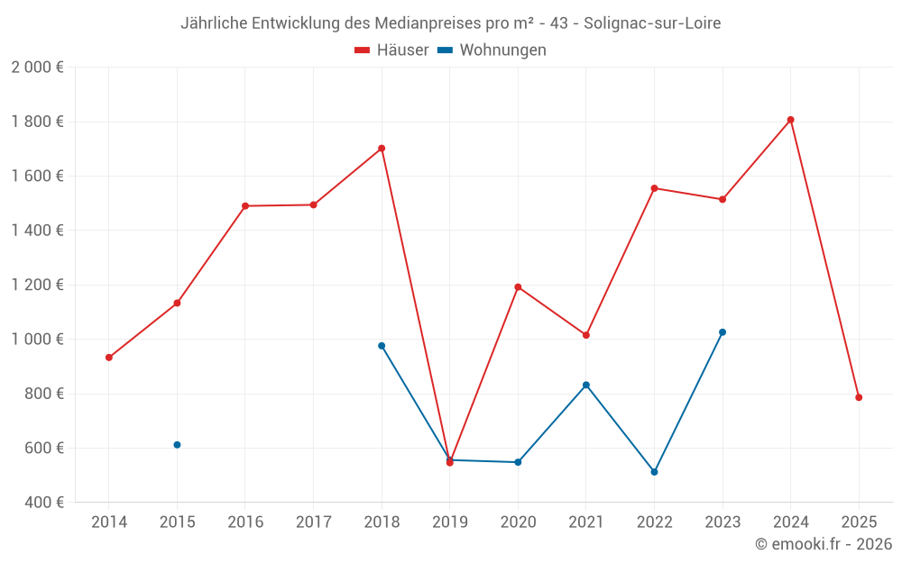 Der Durchschnittspreis auf den 24 Hausgeschäften der letzten 24 Monate in der Gemeinde Solignac-sur-Loire betrug 1 786 € pro Quadratmeter für einen mittleren Immobilienwert von 156 250 €. Über diesen Zeitraum hinweg lagen 60% der Transaktionen zwischen 1 049 und 2 069 € pro Quadratmeter (vom 2. bis zum 8. Dezil).
