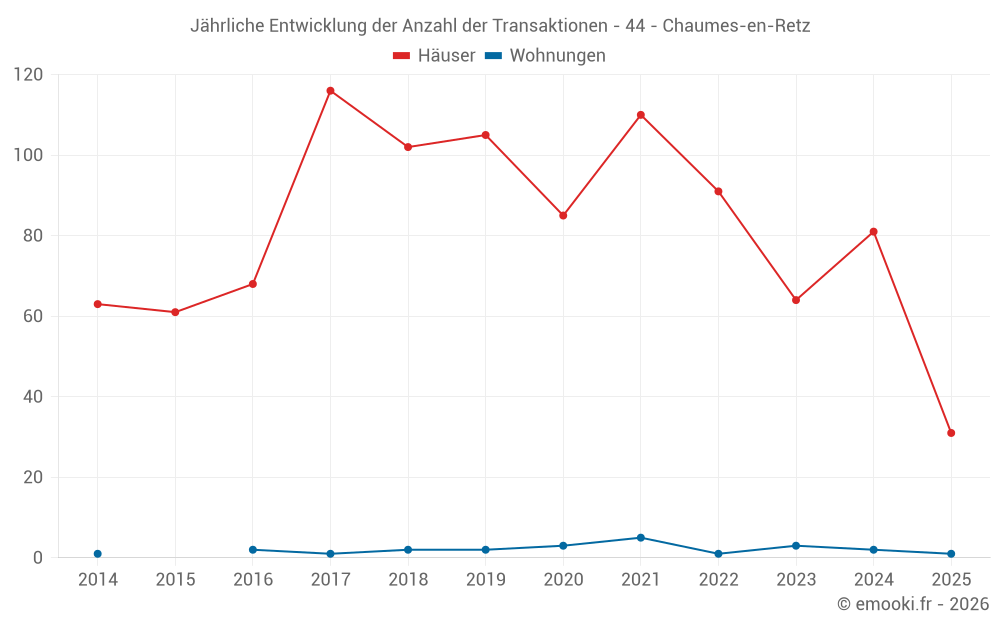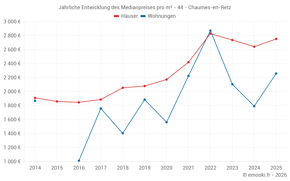 Der Durchschnittspreis auf den 31 Hausgeschäften der letzten 6 Monate in der Gemeinde Chaumes-en-Retz betrug 2 752 € pro Quadratmeter für einen mittleren Immobilienwert von 240 000 €. Über diesen Zeitraum hinweg lagen 60% der Transaktionen zwischen 2 022 und 3 106 € pro Quadratmeter (vom 2. bis zum 8. Dezil).