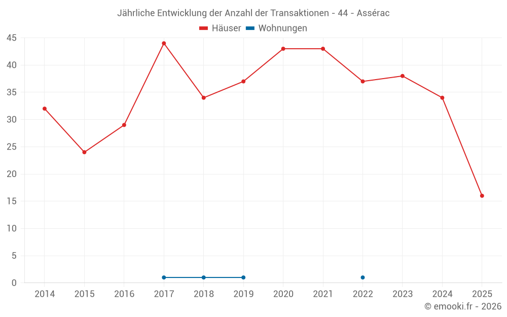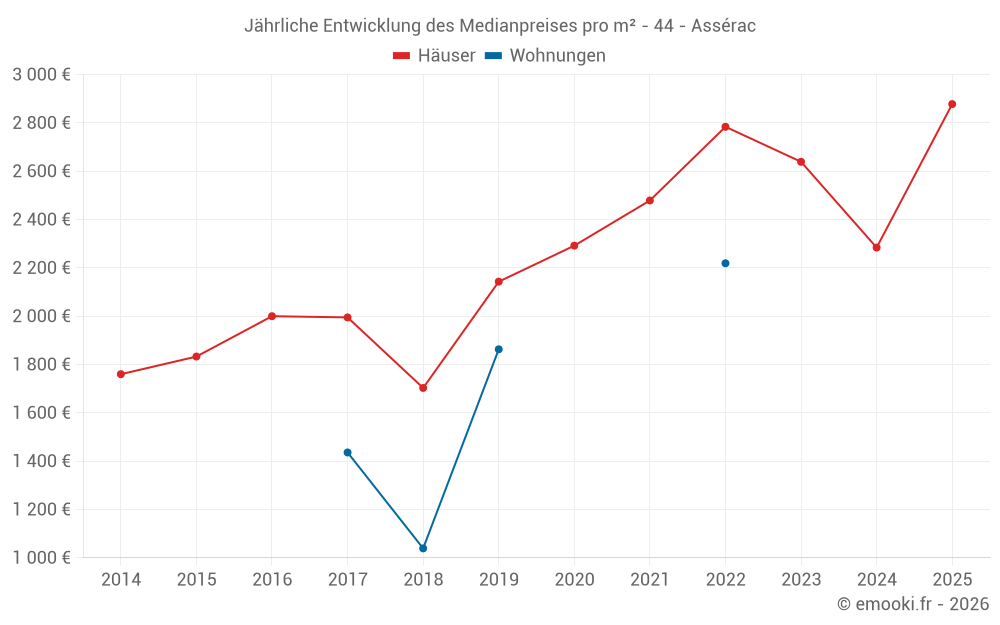 Der Durchschnittspreis auf den 34 Hausgeschäften der letzten 12 Monate in der Gemeinde Assérac betrug 2 854 € pro Quadratmeter für einen mittleren Immobilienwert von 221 000 €. Über diesen Zeitraum hinweg lagen 60% der Transaktionen zwischen 1 926 und 3 637 € pro Quadratmeter (vom 2. bis zum 8. Dezil).