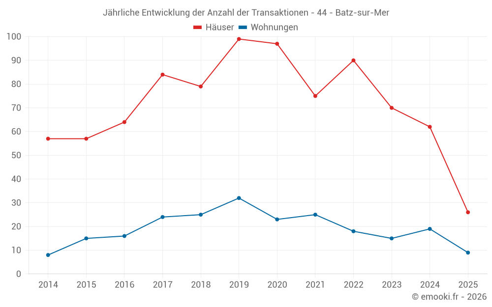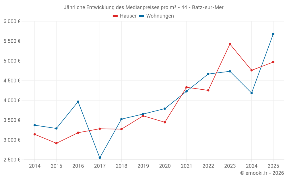 Der Durchschnittspreis auf den 24 Wohnungstransaktionen der letzten 12 Monate in der Gemeinde Batz-sur-Mer betrug 5 234 € pro Quadratmeter für einen mittleren Immobilienwert von 177 700 €. Über diesen Zeitraum hinweg lagen 60% der Transaktionen zwischen 3 109 und 6 275 € pro Quadratmeter (vom 2. bis zum 8. Dezil).