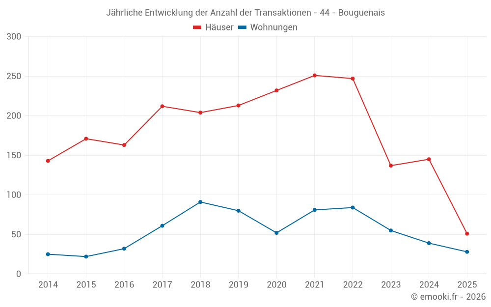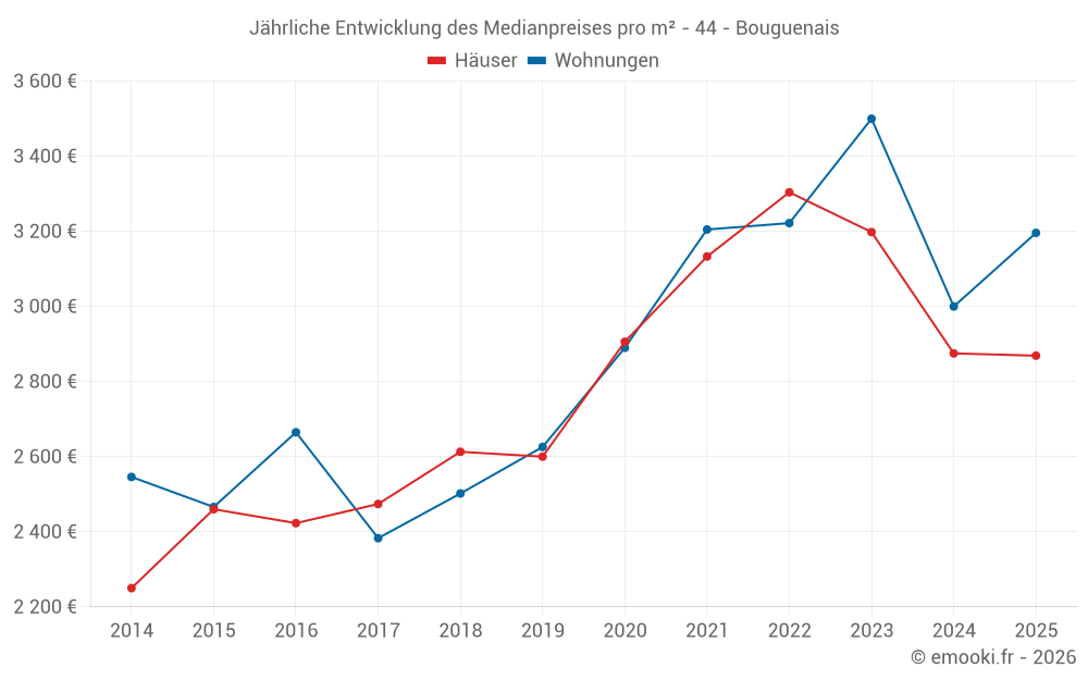 Der Durchschnittspreis auf den 51 Hausgeschäften der letzten 6 Monate in der Gemeinde Bouguenais betrug 2 869 € pro Quadratmeter für einen mittleren Immobilienwert von 250 000 €. Über diesen Zeitraum hinweg lagen 60% der Transaktionen zwischen 2 226 und 3 402 € pro Quadratmeter (vom 2. bis zum 8. Dezil).