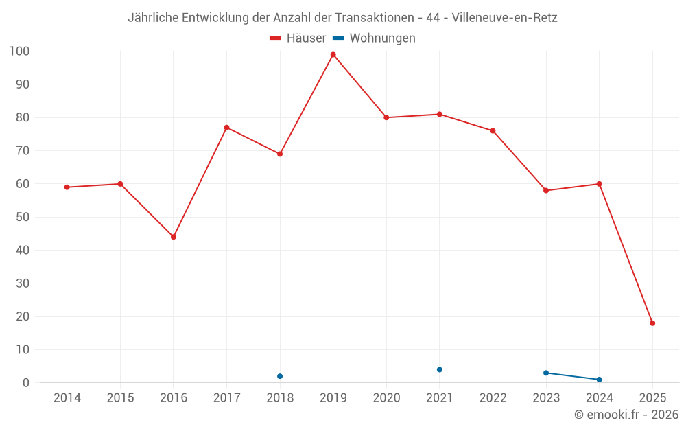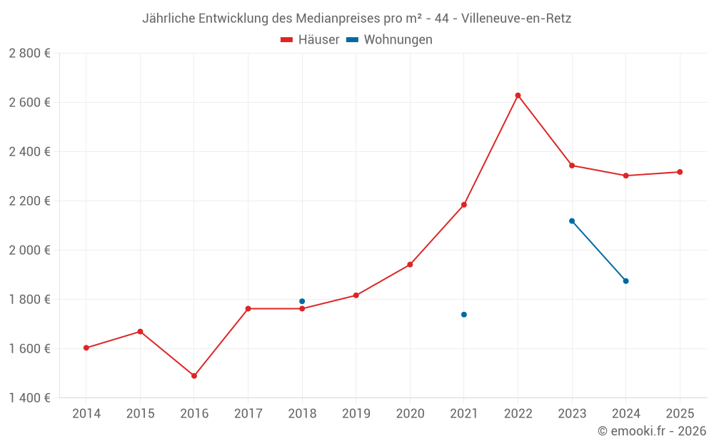 Der Durchschnittspreis auf den 18 Hausgeschäften der letzten 6 Monate in der Gemeinde Villeneuve-en-Retz betrug 2 318 € pro Quadratmeter für einen mittleren Immobilienwert von 197 300 €. Über diesen Zeitraum hinweg lagen 60% der Transaktionen zwischen 2 045 und 2 728 € pro Quadratmeter (vom 2. bis zum 8. Dezil).