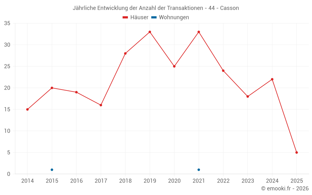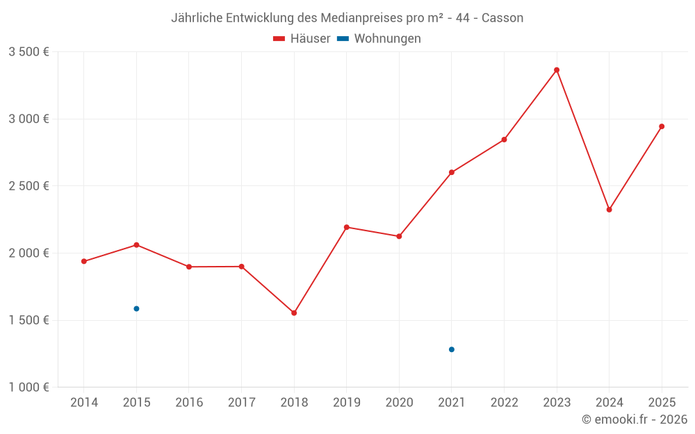 Der Durchschnittspreis auf den 20 Hausgeschäften der letzten 12 Monate in der Gemeinde Casson betrug 2 749 € pro Quadratmeter für einen mittleren Immobilienwert von 293 200 €. Über diesen Zeitraum hinweg lagen 60% der Transaktionen zwischen 2 171 und 3 274 € pro Quadratmeter (vom 2. bis zum 8. Dezil).