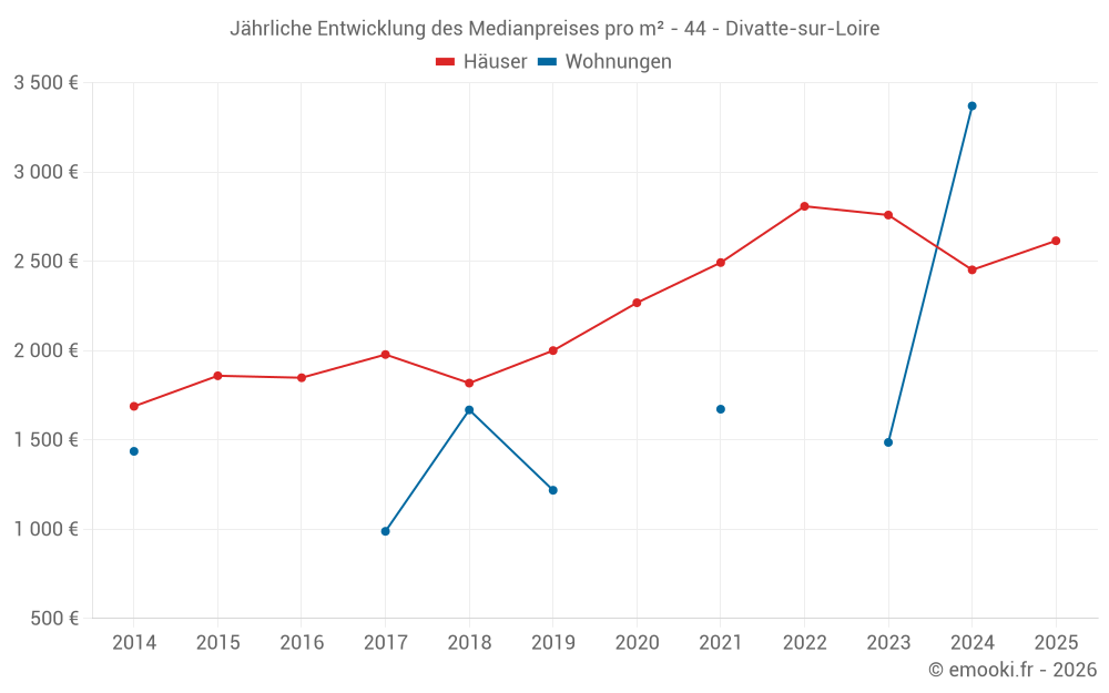 Der Durchschnittspreis auf den 43 Hausgeschäften der letzten 12 Monate in der Gemeinde Divatte-sur-Loire betrug 2 589 € pro Quadratmeter für einen mittleren Immobilienwert von 221 000 €. Über diesen Zeitraum hinweg lagen 60% der Transaktionen zwischen 1 752 und 2 915 € pro Quadratmeter (vom 2. bis zum 8. Dezil).