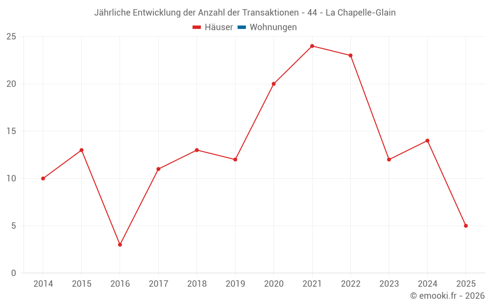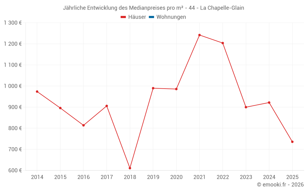 Der Durchschnittspreis auf den 23 Hausgeschäften der letzten 24 Monate in der Gemeinde La Chapelle-Glain betrug 816 € pro Quadratmeter für einen mittleren Immobilienwert von 120 000 €. Über diesen Zeitraum hinweg lagen 60% der Transaktionen zwischen 635 und 1 947 € pro Quadratmeter (vom 2. bis zum 8. Dezil).