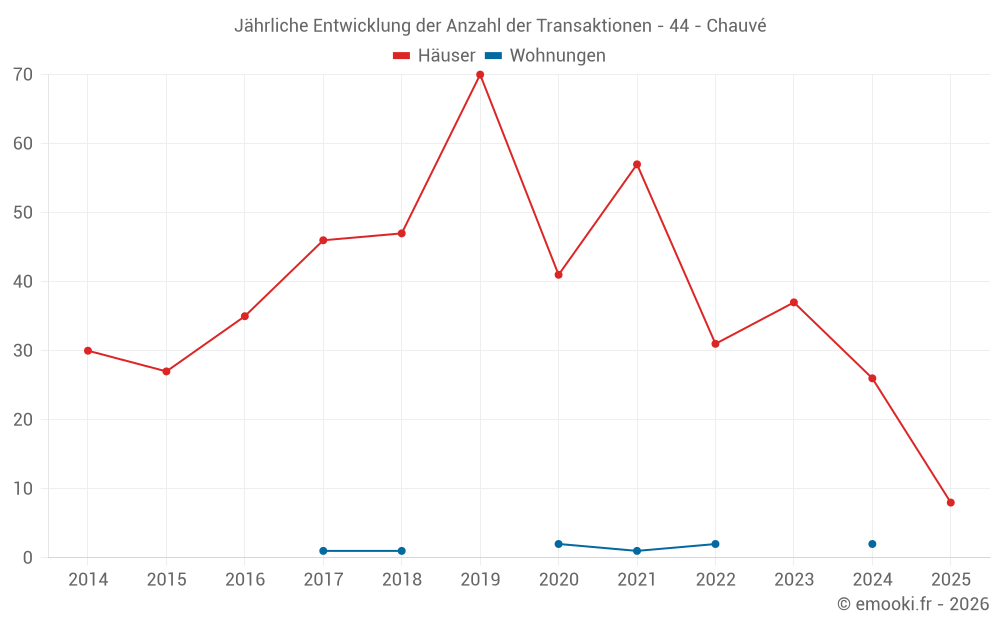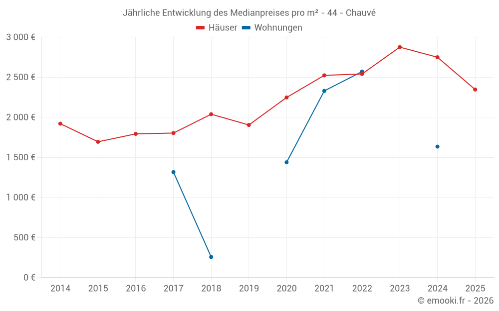Der Durchschnittspreis auf den 22 Hausgeschäften der letzten 12 Monate in der Gemeinde Chauvé betrug 2 523 € pro Quadratmeter für einen mittleren Immobilienwert von 195 000 €. Über diesen Zeitraum hinweg lagen 60% der Transaktionen zwischen 1 968 und 3 275 € pro Quadratmeter (vom 2. bis zum 8. Dezil).