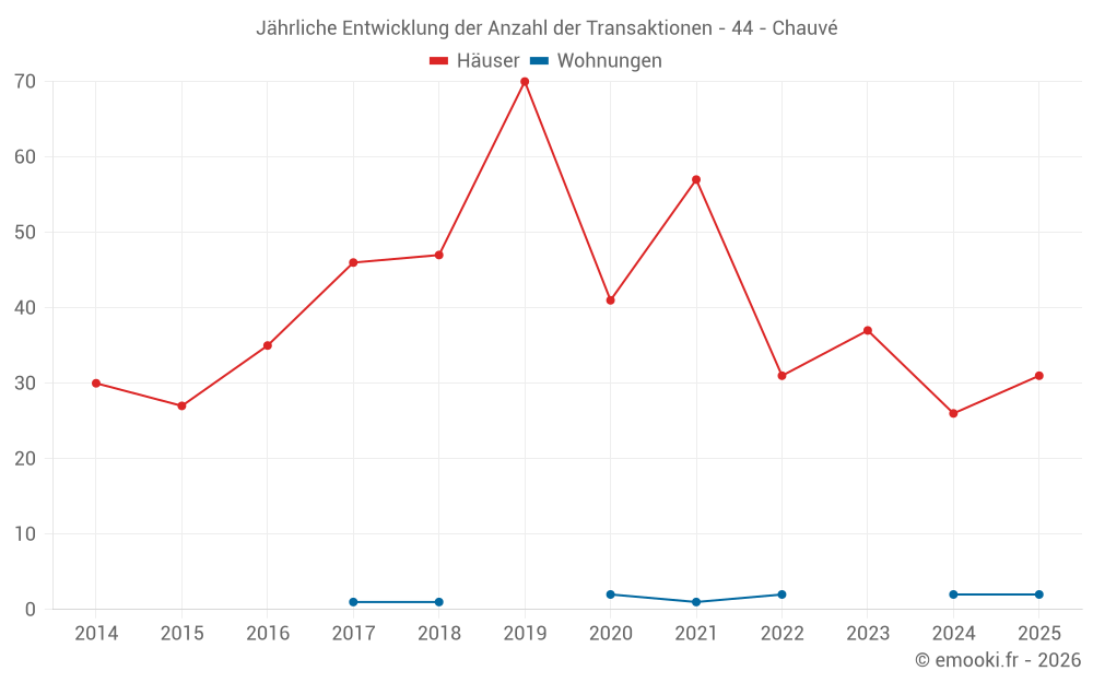 Der Durchschnittspreis auf den 21 Hausgeschäften der letzten 6 Monate in der Gemeinde Chauvé betrug 2 910 € pro Quadratmeter für einen mittleren Immobilienwert von 260 000 €. Über diesen Zeitraum hinweg lagen 60% der Transaktionen zwischen 2 353 und 3 154 € pro Quadratmeter (vom 2. bis zum 8. Dezil).