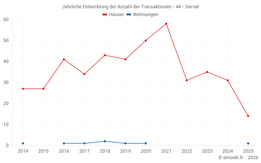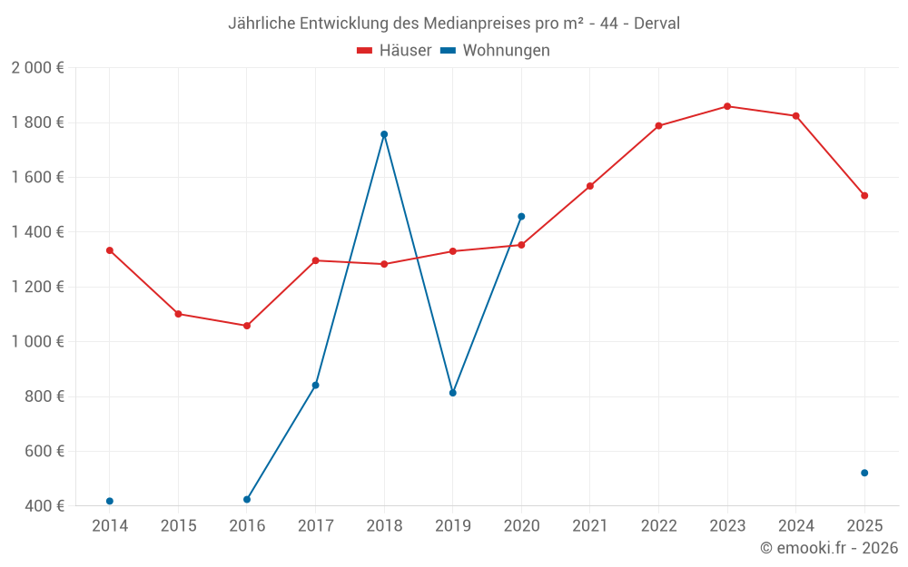 Der Durchschnittspreis auf den 32 Hausgeschäften der letzten 12 Monate in der Gemeinde Derval betrug 1 724 € pro Quadratmeter für einen mittleren Immobilienwert von 165 000 €. Über diesen Zeitraum hinweg lagen 60% der Transaktionen zwischen 1 183 und 2 121 € pro Quadratmeter (vom 2. bis zum 8. Dezil).