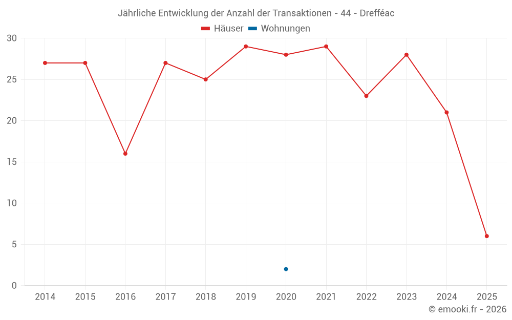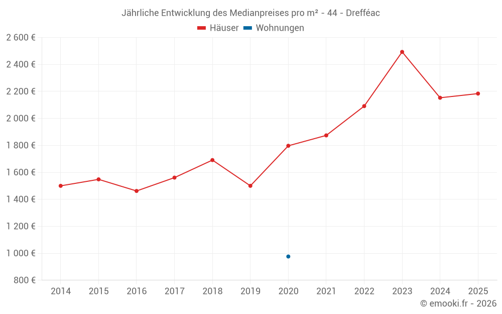 Der Durchschnittspreis auf den 41 Hausgeschäften der letzten 24 Monate in der Gemeinde Drefféac betrug 2 237 € pro Quadratmeter für einen mittleren Immobilienwert von 220 000 €. Über diesen Zeitraum hinweg lagen 60% der Transaktionen zwischen 1 786 und 2 592 € pro Quadratmeter (vom 2. bis zum 8. Dezil).