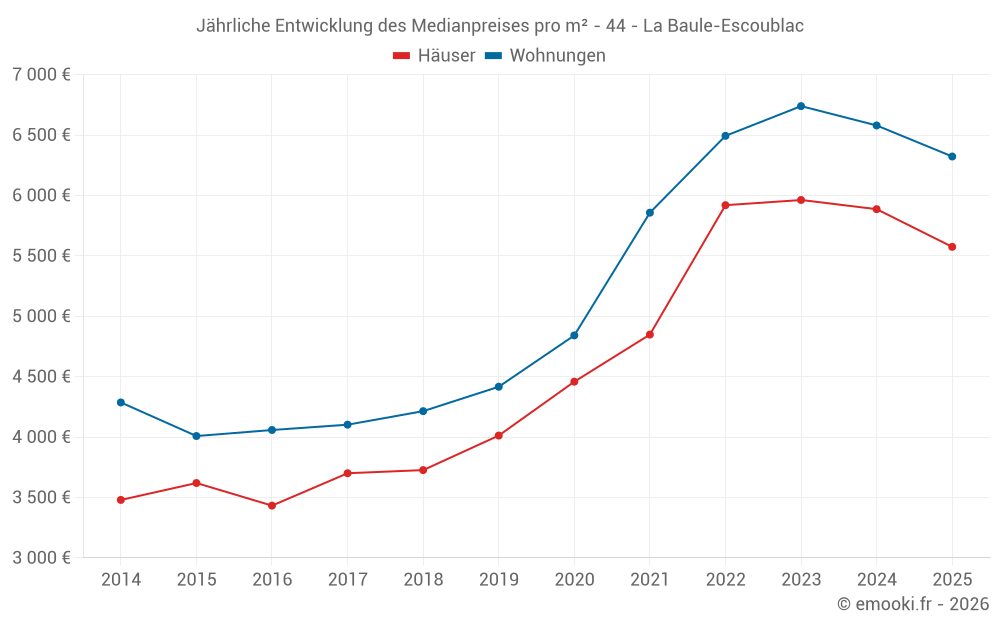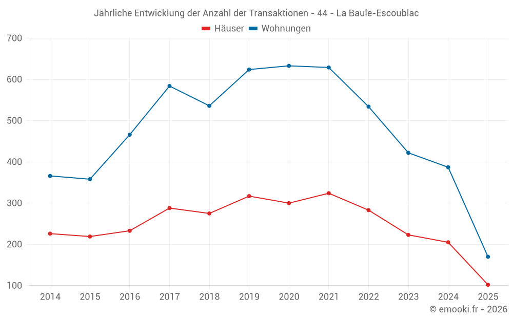 Der Durchschnittspreis auf den 30 Hausgeschäften der letzten 3 Monate in der Gemeinde La Baule-Escoublac betrug 6 276 € pro Quadratmeter für einen mittleren Immobilienwert von 600 500 €. Über diesen Zeitraum hinweg lagen 60% der Transaktionen zwischen 3 644 und 8 646 € pro Quadratmeter (vom 2. bis zum 8. Dezil).