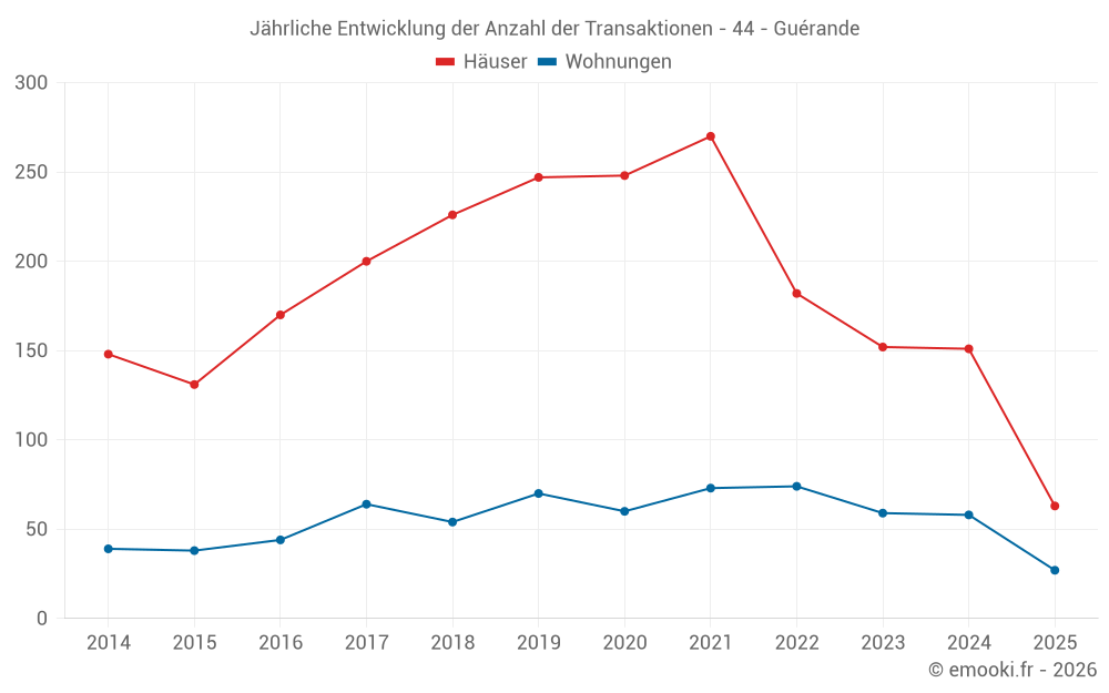 Der Durchschnittspreis auf den 27 Wohnungstransaktionen der letzten 6 Monate in der Gemeinde Guérande betrug 3 939 € pro Quadratmeter für einen mittleren Immobilienwert von 200 000 €. Über diesen Zeitraum hinweg lagen 60% der Transaktionen zwischen 2 827 und 4 412 € pro Quadratmeter (vom 2. bis zum 8. Dezil).