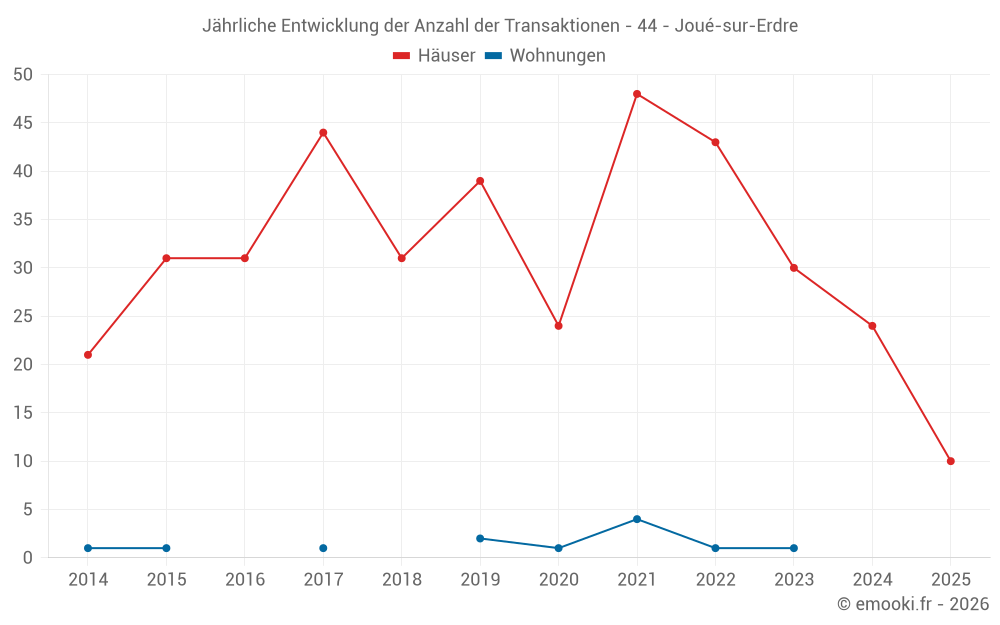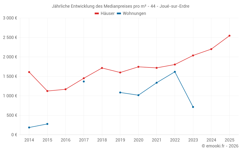 Der Durchschnittspreis auf den 23 Hausgeschäften der letzten 12 Monate in der Gemeinde Joué-sur-Erdre betrug 2 431 € pro Quadratmeter für einen mittleren Immobilienwert von 193 000 €. Über diesen Zeitraum hinweg lagen 60% der Transaktionen zwischen 1 782 und 3 131 € pro Quadratmeter (vom 2. bis zum 8. Dezil).