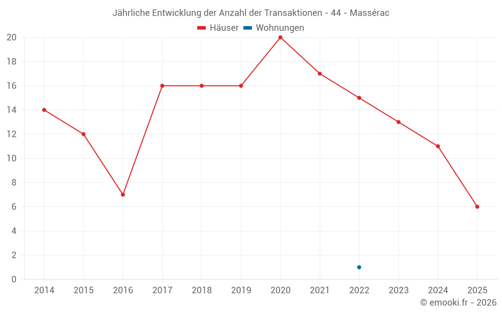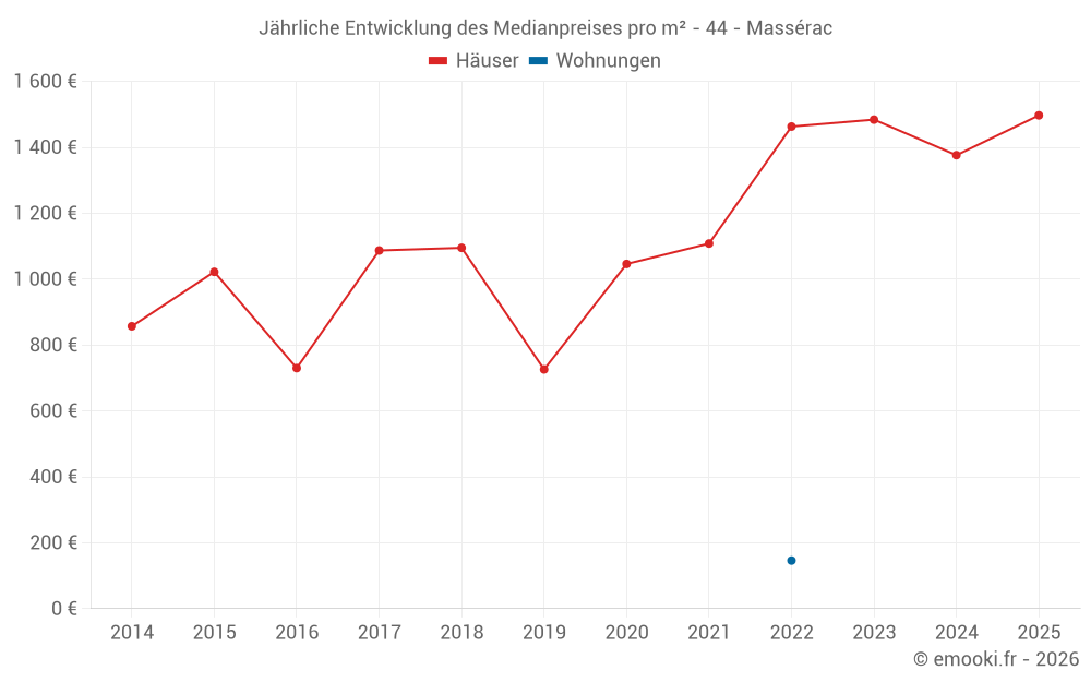 Der Durchschnittspreis auf den 25 Hausgeschäften der letzten 24 Monate in der Gemeinde Massérac betrug 1 484 € pro Quadratmeter für einen mittleren Immobilienwert von 135 000 €. Über diesen Zeitraum hinweg lagen 60% der Transaktionen zwischen 934 und 2 060 € pro Quadratmeter (vom 2. bis zum 8. Dezil).