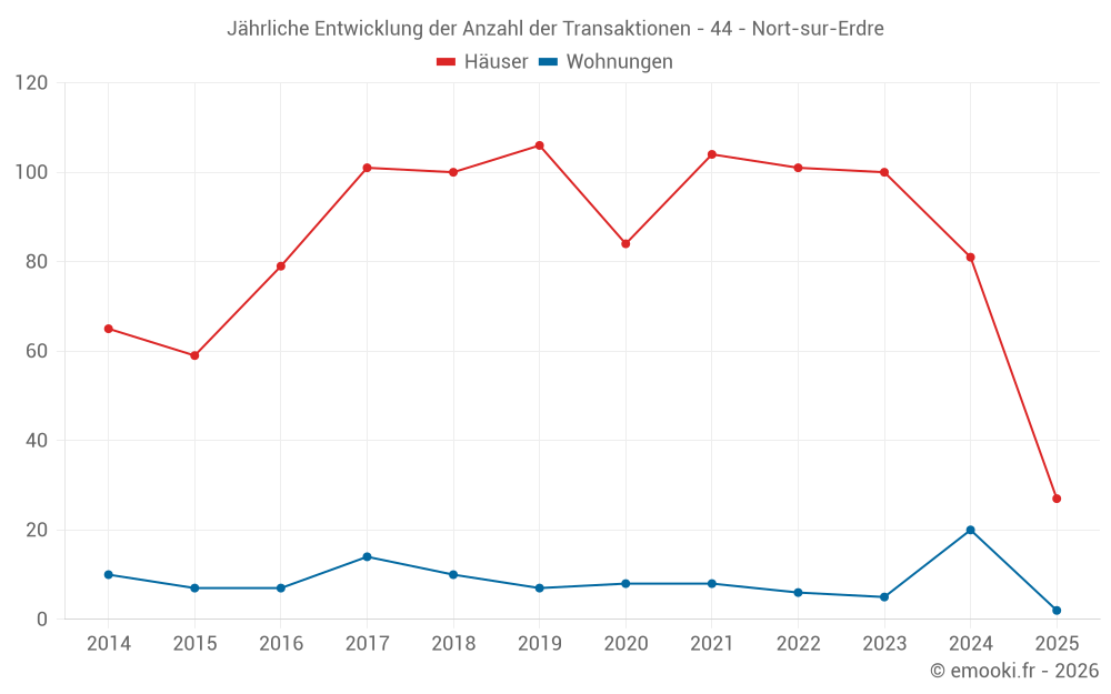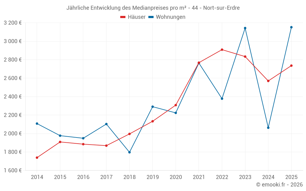 Der Durchschnittspreis auf den 27 Hausgeschäften der letzten 6 Monate in der Gemeinde Nort-sur-Erdre betrug 2 736 € pro Quadratmeter für einen mittleren Immobilienwert von 257 000 €. Über diesen Zeitraum hinweg lagen 60% der Transaktionen zwischen 2 080 und 3 349 € pro Quadratmeter (vom 2. bis zum 8. Dezil).