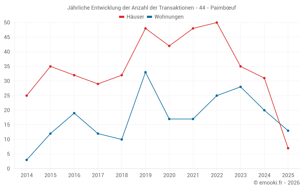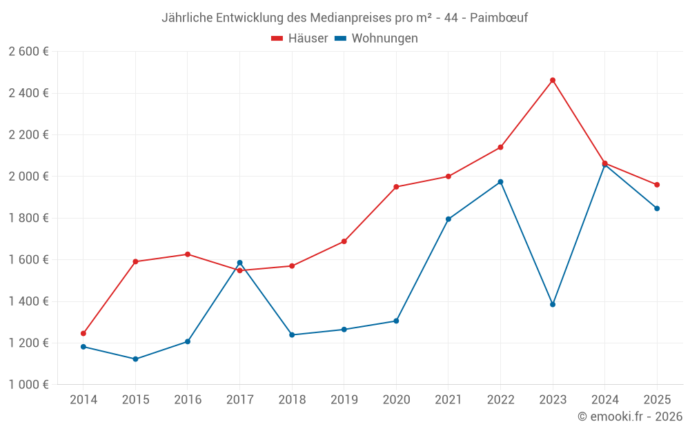 Der Durchschnittspreis auf den 19 Hausgeschäften der letzten 12 Monate in der Gemeinde Paimbœuf betrug 1 729 € pro Quadratmeter für einen mittleren Immobilienwert von 196 000 €. Über diesen Zeitraum hinweg lagen 60% der Transaktionen zwischen 1 333 und 2 585 € pro Quadratmeter (vom 2. bis zum 8. Dezil).