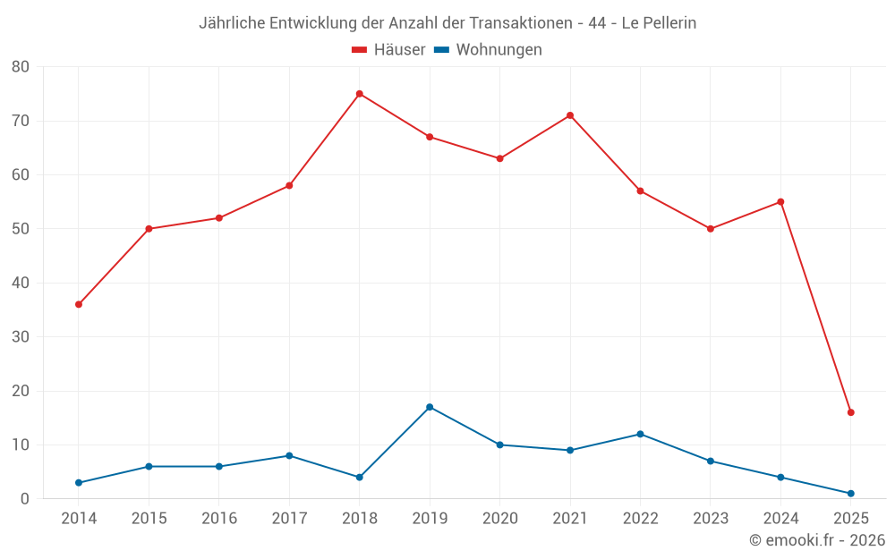 Der Durchschnittspreis auf den 46 Hausgeschäften der letzten 12 Monate in der Gemeinde Le Pellerin betrug 2 653 € pro Quadratmeter für einen mittleren Immobilienwert von 242 500 €. Über diesen Zeitraum hinweg lagen 60% der Transaktionen zwischen 1 857 und 3 065 € pro Quadratmeter (vom 2. bis zum 8. Dezil).