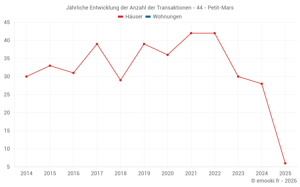 Der Durchschnittspreis auf den 19 Hausgeschäften der letzten 12 Monate in der Gemeinde Petit-Mars betrug 2 460 € pro Quadratmeter für einen mittleren Immobilienwert von 257 000 €. Über diesen Zeitraum hinweg lagen 60% der Transaktionen zwischen 1 599 und 3 078 € pro Quadratmeter (vom 2. bis zum 8. Dezil).