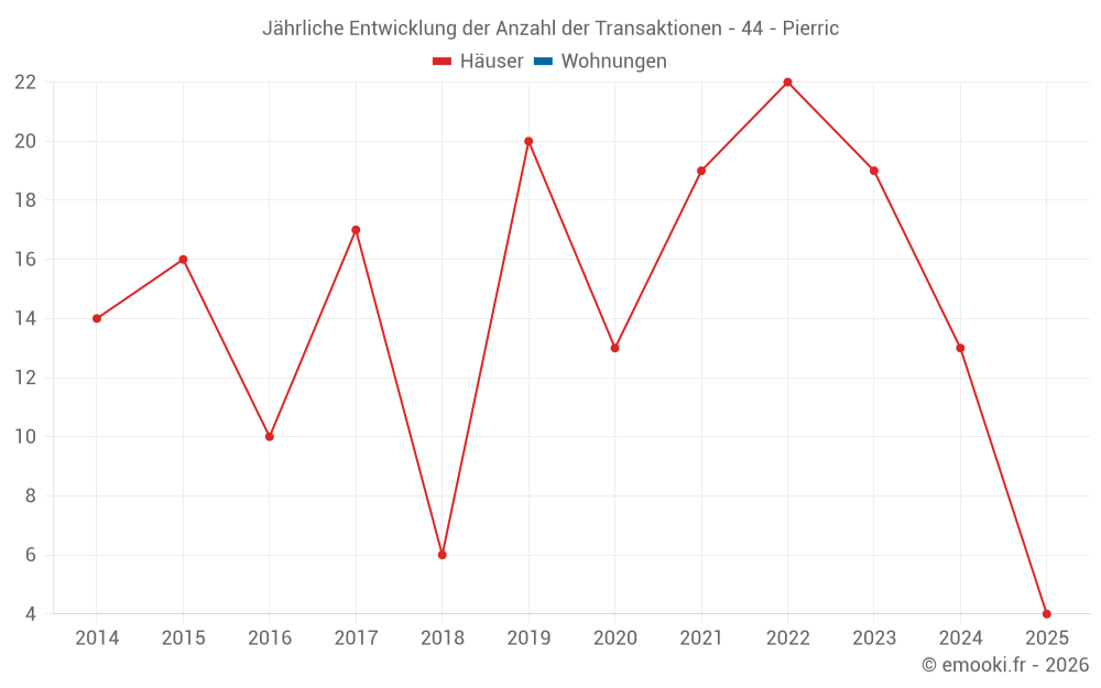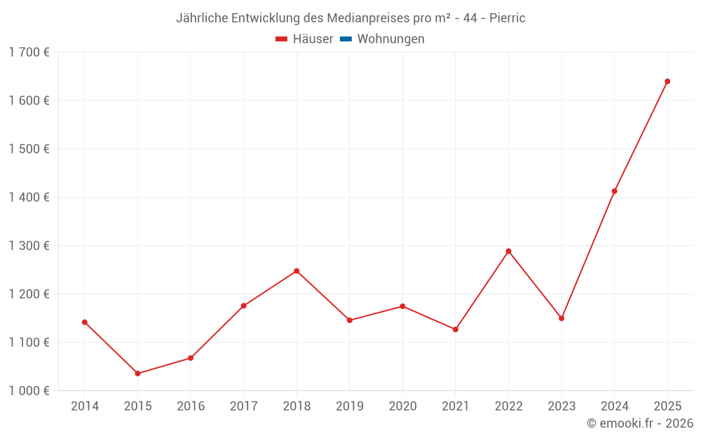 Der Durchschnittspreis auf den 28 Hausgeschäften der letzten 24 Monate in der Gemeinde Pierric betrug 1 452 € pro Quadratmeter für einen mittleren Immobilienwert von 157 500 €. Über diesen Zeitraum hinweg lagen 60% der Transaktionen zwischen 826 und 1 676 € pro Quadratmeter (vom 2. bis zum 8. Dezil).