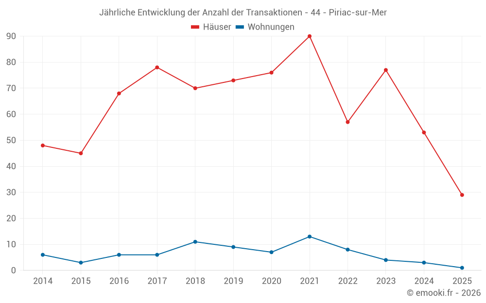Der Durchschnittspreis auf den 29 Hausgeschäften der letzten 6 Monate in der Gemeinde Piriac-sur-Mer betrug 4 293 € pro Quadratmeter für einen mittleren Immobilienwert von 409 900 €. Über diesen Zeitraum hinweg lagen 60% der Transaktionen zwischen 3 010 und 6 122 € pro Quadratmeter (vom 2. bis zum 8. Dezil).