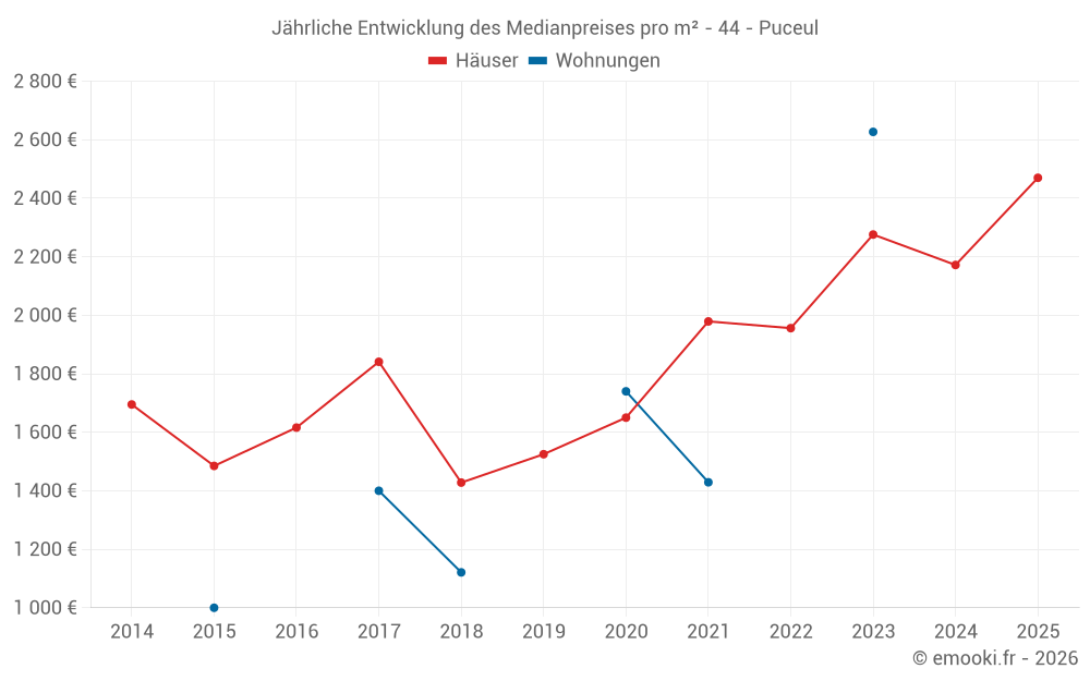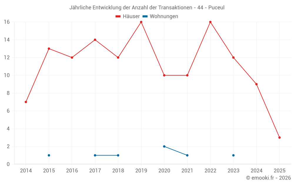 Der Durchschnittspreis auf den 18 Hausgeschäften der letzten 24 Monate in der Gemeinde Puceul betrug 2 282 € pro Quadratmeter für einen mittleren Immobilienwert von 209 500 €. Über diesen Zeitraum hinweg lagen 60% der Transaktionen zwischen 2 130 und 2 724 € pro Quadratmeter (vom 2. bis zum 8. Dezil).