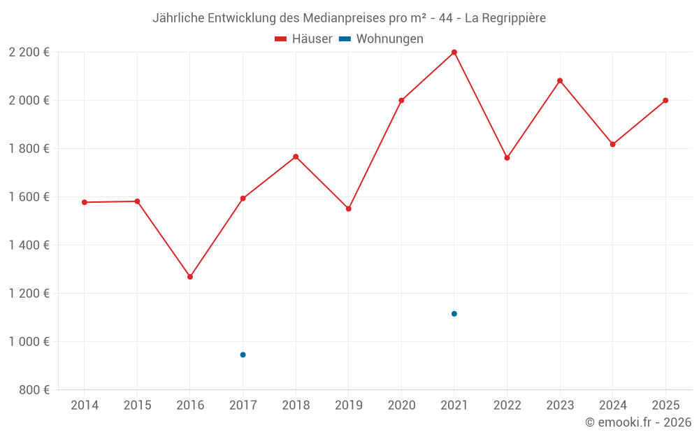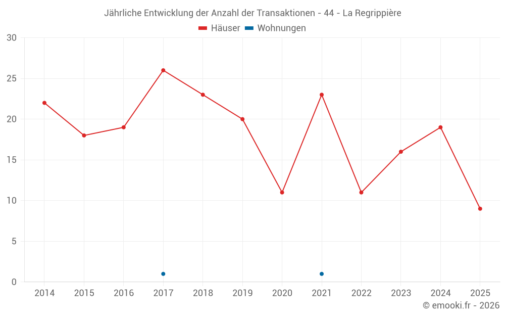 Der Durchschnittspreis auf den 18 Hausgeschäften der letzten 12 Monate in der Gemeinde La Regrippière betrug 1 986 € pro Quadratmeter für einen mittleren Immobilienwert von 182 750 €. Über diesen Zeitraum hinweg lagen 60% der Transaktionen zwischen 1 001 und 2 589 € pro Quadratmeter (vom 2. bis zum 8. Dezil).