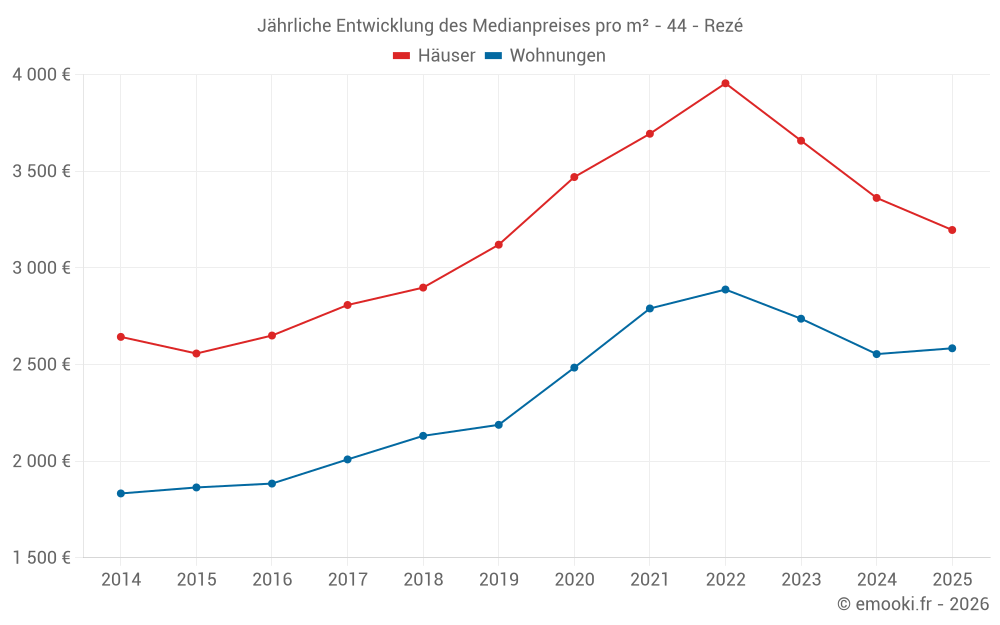 Der Durchschnittspreis auf den 37 Hausgeschäften der letzten 3 Monate in der Gemeinde Rezé betrug 3 139 € pro Quadratmeter für einen mittleren Immobilienwert von 310 000 €. Über diesen Zeitraum hinweg lagen 60% der Transaktionen zwischen 2 778 und 3 855 € pro Quadratmeter (vom 2. bis zum 8. Dezil).