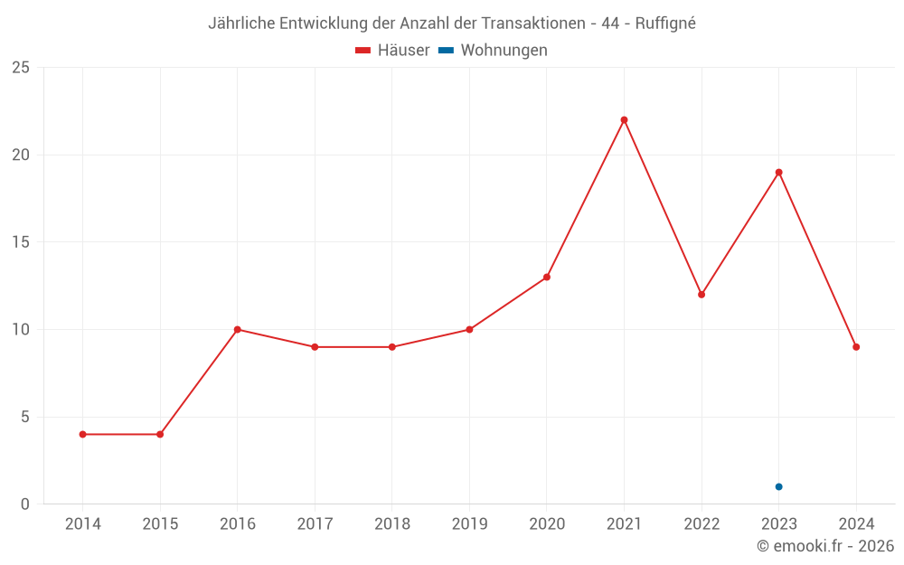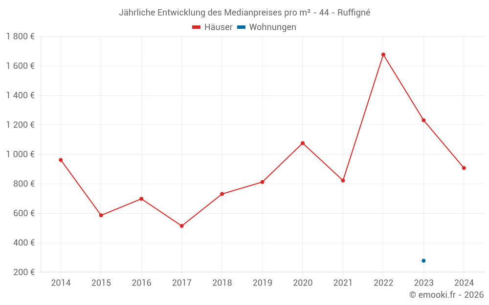 Der Durchschnittspreis auf den 20 Hausgeschäften der letzten 24 Monate in der Gemeinde Ruffigné betrug 1 178 € pro Quadratmeter für einen mittleren Immobilienwert von 100 000 €. Über diesen Zeitraum hinweg lagen 60% der Transaktionen zwischen 569 und 1 521 € pro Quadratmeter (vom 2. bis zum 8. Dezil).