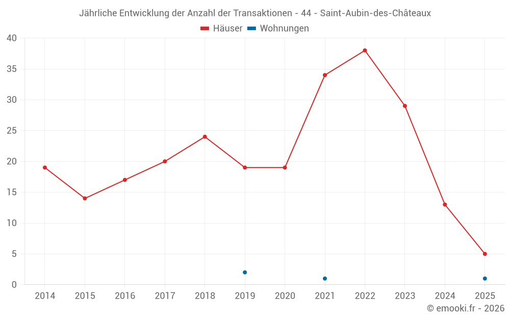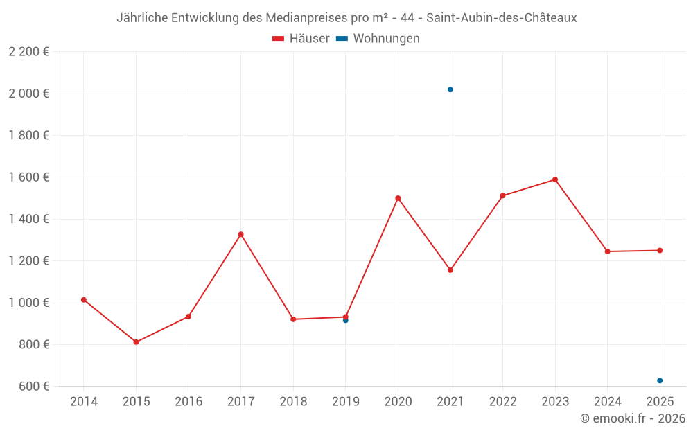 Der Durchschnittspreis auf den 31 Hausgeschäften der letzten 24 Monate in der Gemeinde Saint-Aubin-des-Châteaux betrug 1 420 € pro Quadratmeter für einen mittleren Immobilienwert von 150 000 €. Über diesen Zeitraum hinweg lagen 60% der Transaktionen zwischen 1 170 und 1 900 € pro Quadratmeter (vom 2. bis zum 8. Dezil).